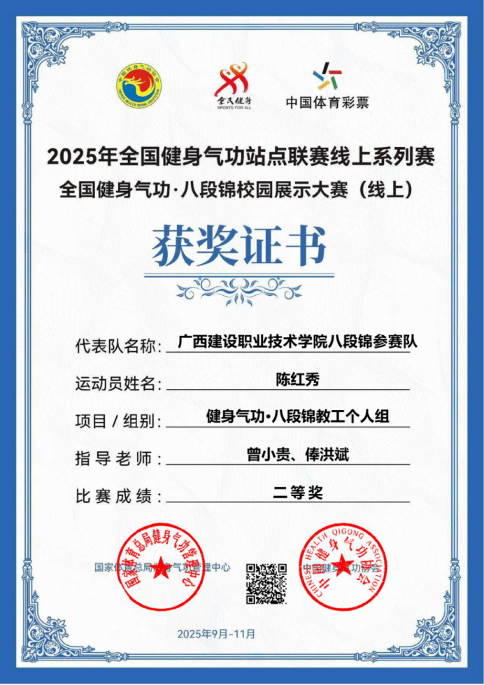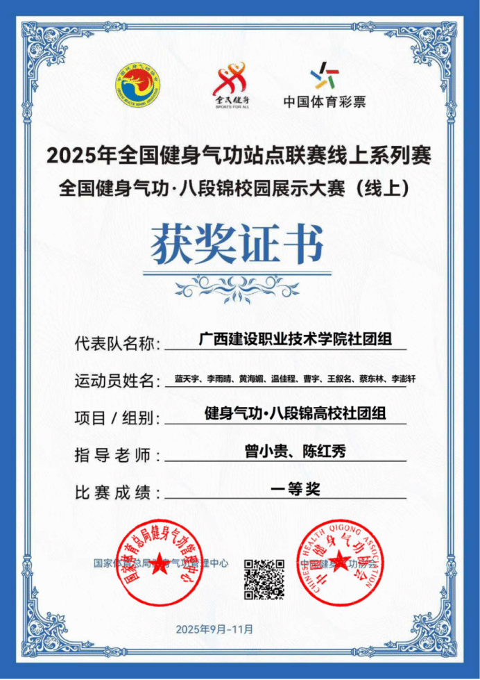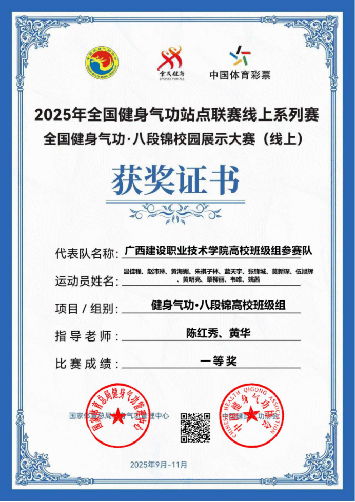 本次大赛由国家体育总局健身气功管理中心、中国健身气功协会联合主办,以云端竞技形式开展,吸引全国170所高校数千名学生参与。在激烈竞争中,OD(中国)一站式服务平台市政2401班代表队从447支班级组队伍中脱颖而出,以排名第15的成绩荣获一等奖;社团组代表队面对1217支参赛队伍,凭借稳定发挥以第128名摘得一等奖。