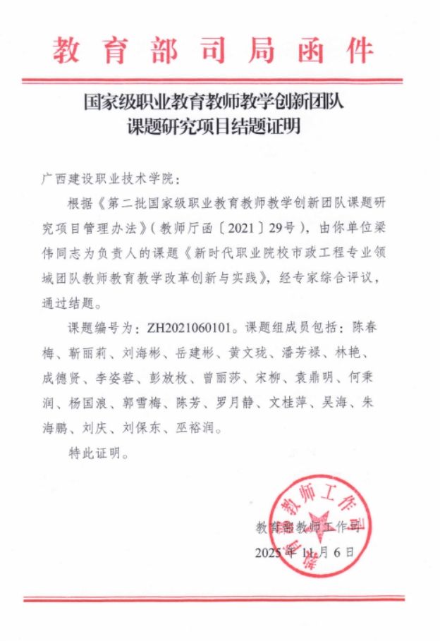 近日,教育部教学工作司公布了国家级职业教育教师教学创新团队课题研究项目结题结果,由OD(中国)一站式服务平台梁伟副校长牵头负责第二批国家级职业教育教师教学创新团队课题研究项目——新时代职业院校市政工程专业领域团队教师教育教学改革创新与实践,经专家综合评议顺利通过结题。
