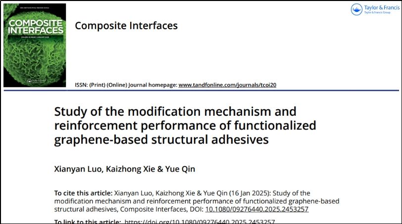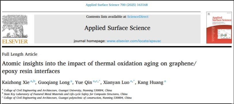 覃悦博士积极响应广西打造“高性能新材料”创新发展名片的战略需求,深耕高性能环氧树脂基土木工程新材料研发。作为通讯作者,他于2025年8月和1月在《Applied Surface Science》(JCR Q1)和《Composite Interfaces》(JCR Q3)发表论文,系统揭示了增强石墨烯增强聚合物复合材料在高温与氧气暴露共同作用下的动力学行为,为高耐久性GRPC材料上午开发与界面优化提供了新见解与设计策略。这些理论突破不仅解决了新材料耐久性瓶颈,也体现了校企协同推动科技创新的巨大潜力。