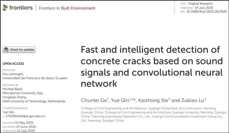 覃悦博士始终坚持将科研扎根工程一线,直面od平台官方官网业智能化转型中的实际问题。针对混凝土结构检测长期依赖人工、效率低下的问题,他精益求精,带领团队开发出基于敲击与改进的卷积神经网络(CNN)的混凝土裂缝快速检测方法,实现了无损、快速、高精度的智能识别。该成果于2025年7月发表于《Frontiers in Built Environment》(JCR Q2),既显著提升检测效率,又为城市更新提供了可靠技术支持,是现代工匠精神在科研实践中的生动诠释。
