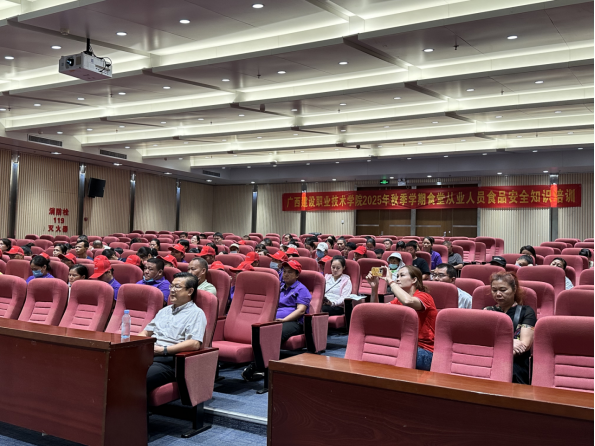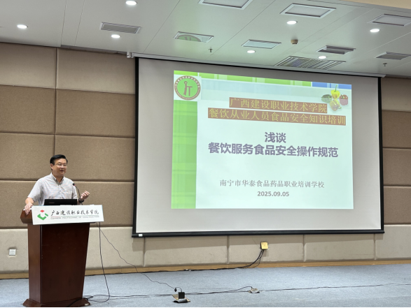 本次培训特邀南宁市华泰食品药品职业培训学校资深专家黄莉莉老师进行专题授课。黄老师以《餐饮服务食品安全操作规范》为主线,结合高校食堂实际与典型案例,系统讲解了从业人员健康管理、食品贮存规范、加工制作关键控制点以及场所设施清洁维护等重点内容。讲解深入浅出,贴近实际,现场学习氛围浓厚。