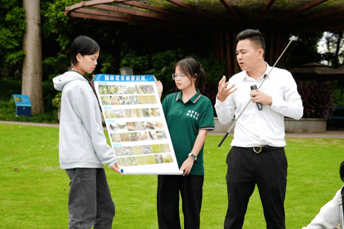 劳德涌(广西造福园林绿化工程有限公司总经理)在南宁园博园为学员讲解常见病虫害识别、生物防治与物理防治技术、科学用药知识