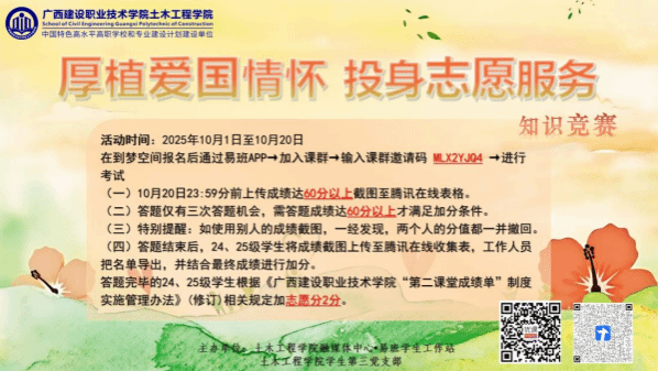 投身志愿服务,担当时代之责。学院积极引导学生将爱国情怀转化为服务社会的实际行动。“厚植爱国情怀,投身志愿服务”知识竞赛普及了志愿服务理念;而“爱国卫生运动,共创文明城市”与“共清邕江之畔,同贺祖国华诞”公益环保志愿服务活动则提供了实践平台。师生们共同劳动,美化家园,以实干精神诠释了“强国复兴有我”的责任担当,展现了土木学子的良好风貌。