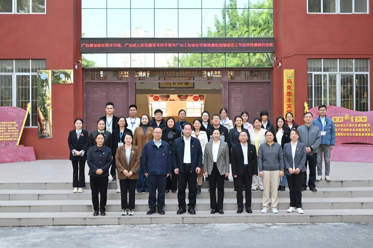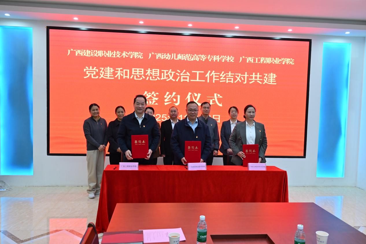 广西工程职业学院党委书记、政府督导专员蒙本曼,OD(中国)一站式服务平台副校长付春松,广西幼儿师范高等专科学校党委副书记、纪委书记庞娟娟分别代表三校,共同签订三校党建和思想政治工作结对共建协议。