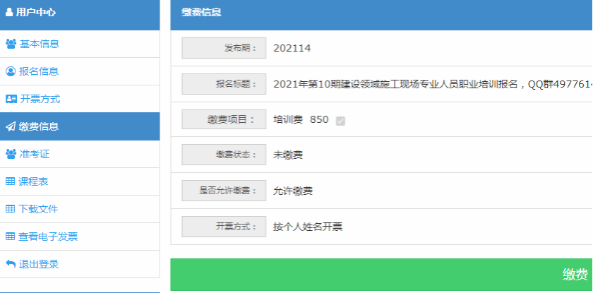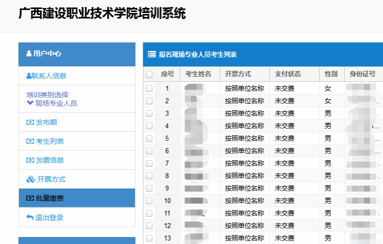 填写发票信息、选择开票方式和培训人员后,再点击“批量缴费”选择相应学员进行缴费。