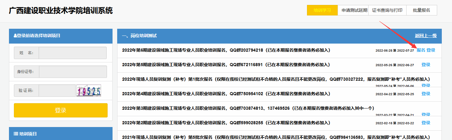 登陆(/jxjy/)od平台官方官网继续教育网→各类考试报名系统→岗位培训测试→点击“批量报名”→输入用户名、密码登录。(如无批量报名账号需先注册)