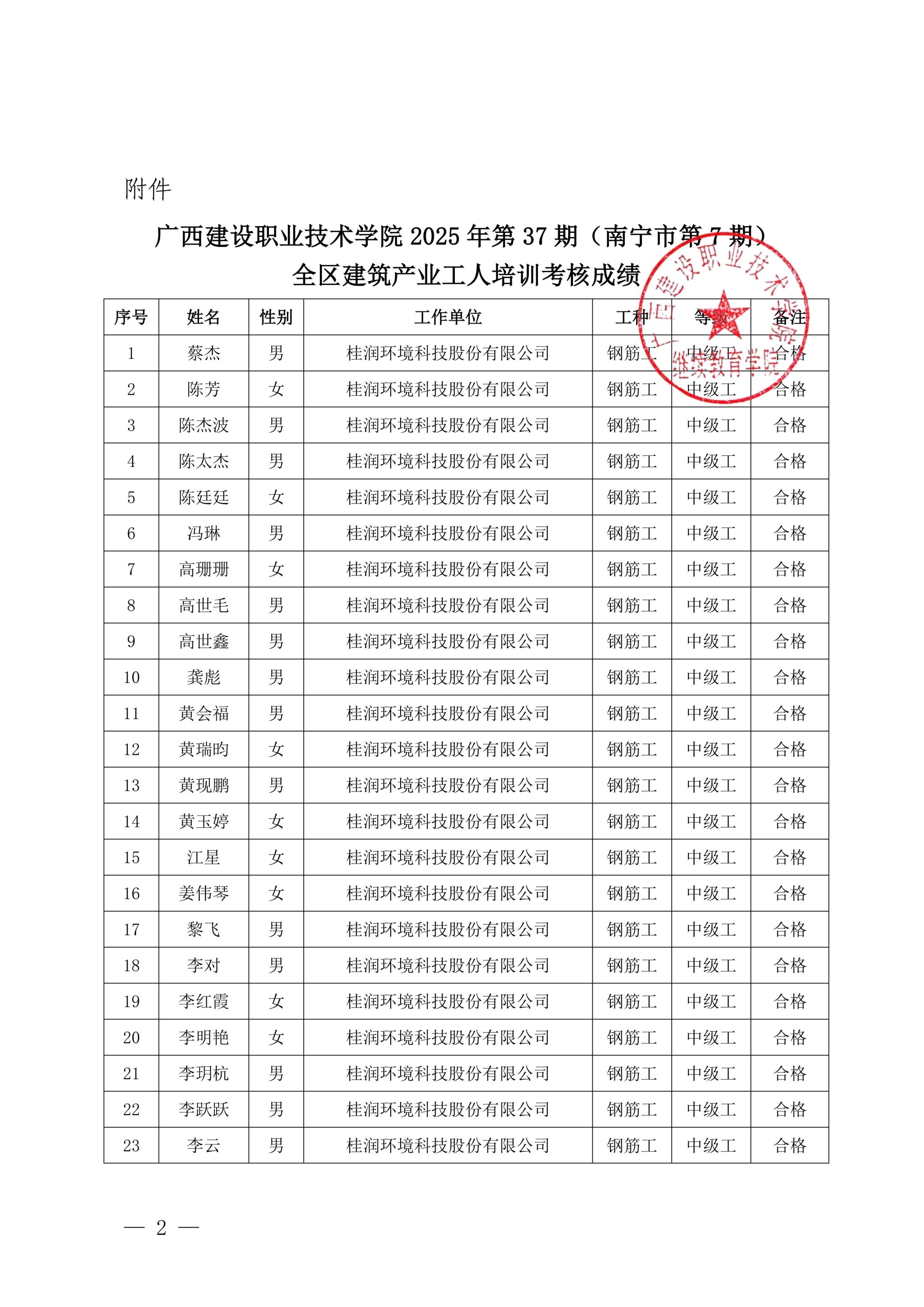 关于od平台官方官网2025年全区od平台官方官网产业工人第37期(南宁市第7期)培训考核成绩的公示