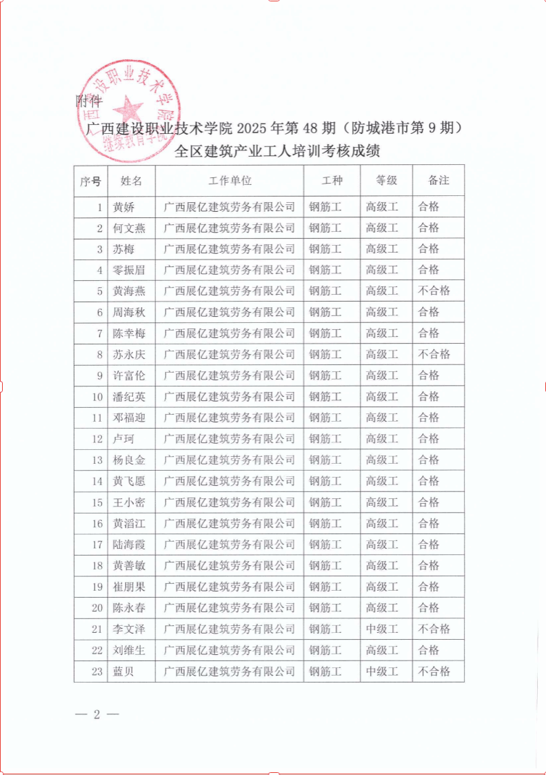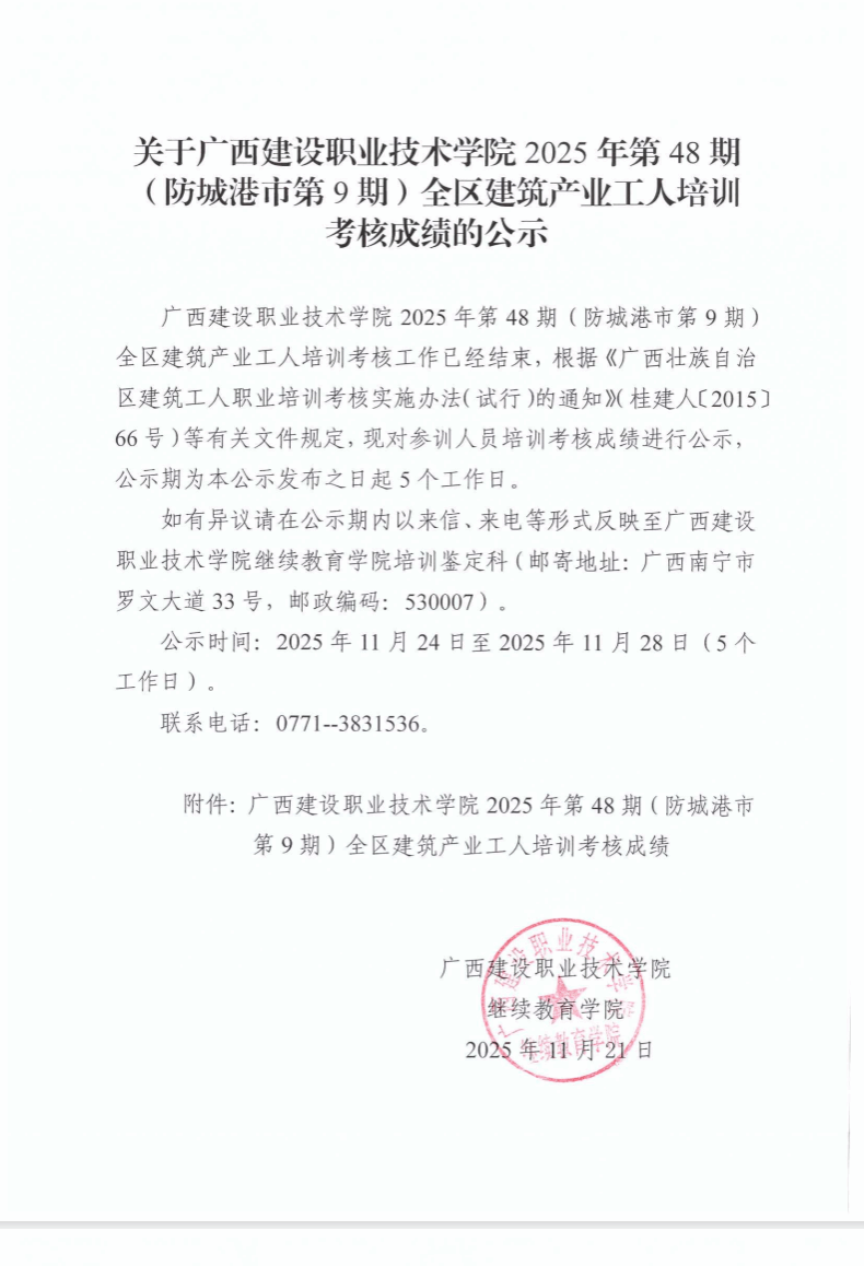 培训信息 当前位置: 首页 >> 培训信息 >> 正文 关于od平台官方官网2025年全区od平台官方官网产业工人第48期(防城港市第9期)培训考核成绩的公示 发布日期:2025-11-21 点击: 附件【关于od平台官方官网2025年全区od平台官方官网产业工人第48期(防城港市第9期)培训考核成绩的公示.pdf】已下载次