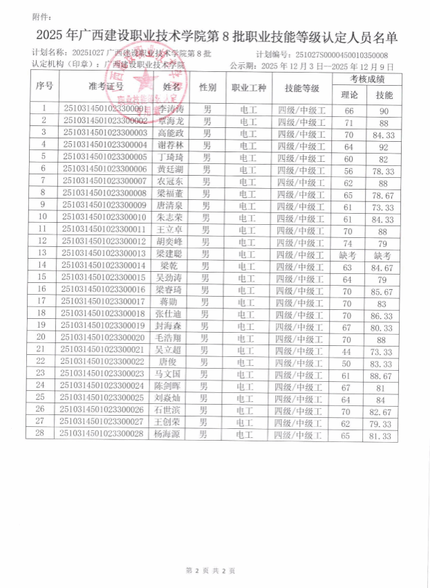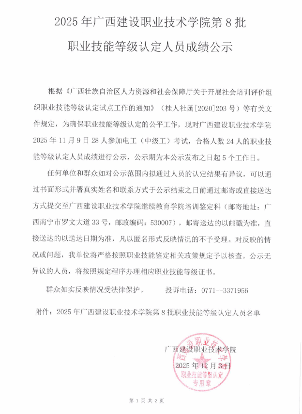培训信息 当前位置: 首页 >> 培训信息 >> 正文 2025年od平台官方官网第8批职业技能等级认定人员成绩公示 发布日期:2025-12-03 点击: 附件【2025年od平台官方官网第8批职业技能等级认定人员成绩公示.pdf】已下载次