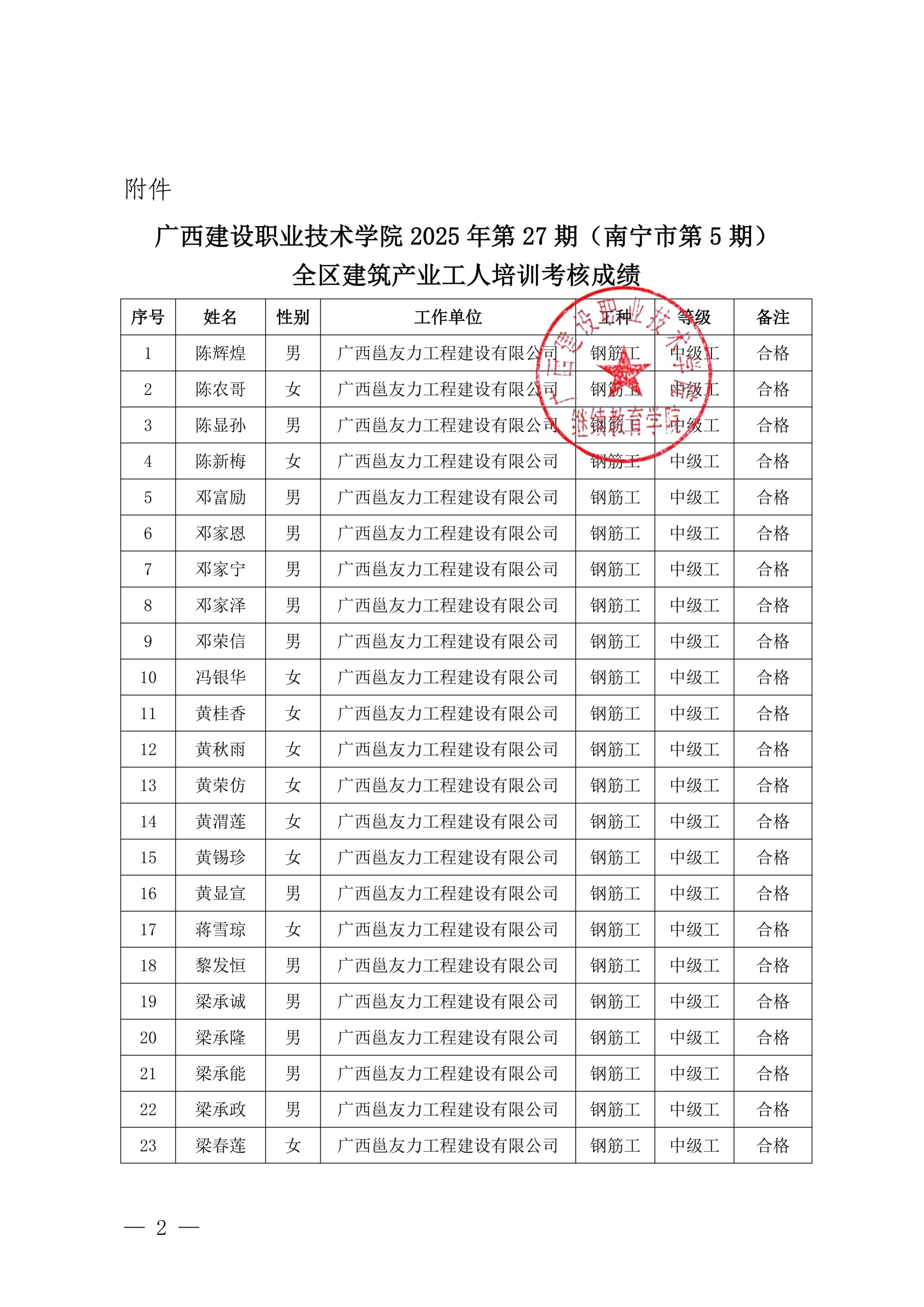 关于od平台官方官网2025年第27期(南宁市第5期)全区od平台官方官网产业工人培训考核成绩的公示