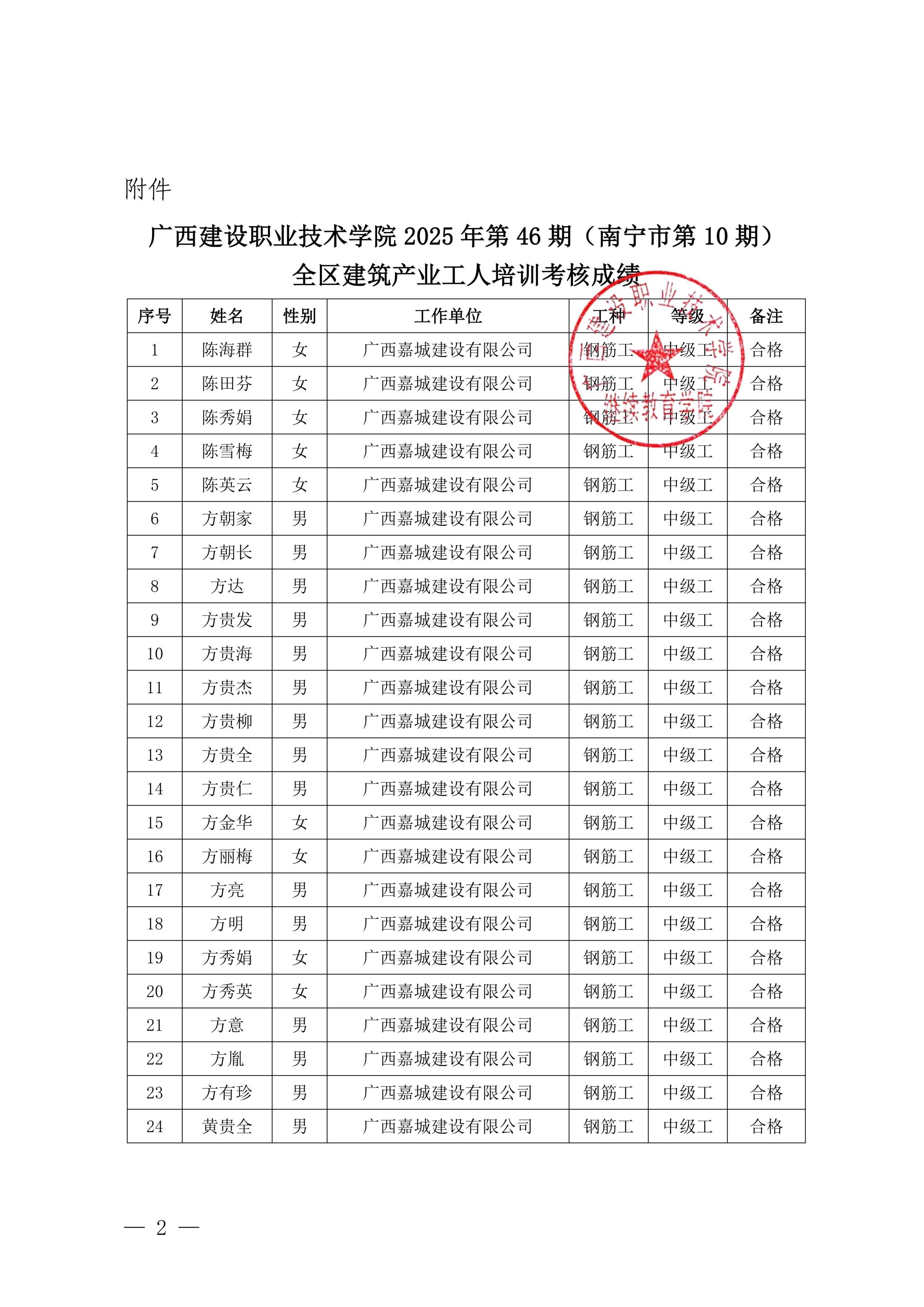 关于od平台官方官网2025年第46期(南宁市第10期)全区od平台官方官网产业工人培训考核成绩的公示