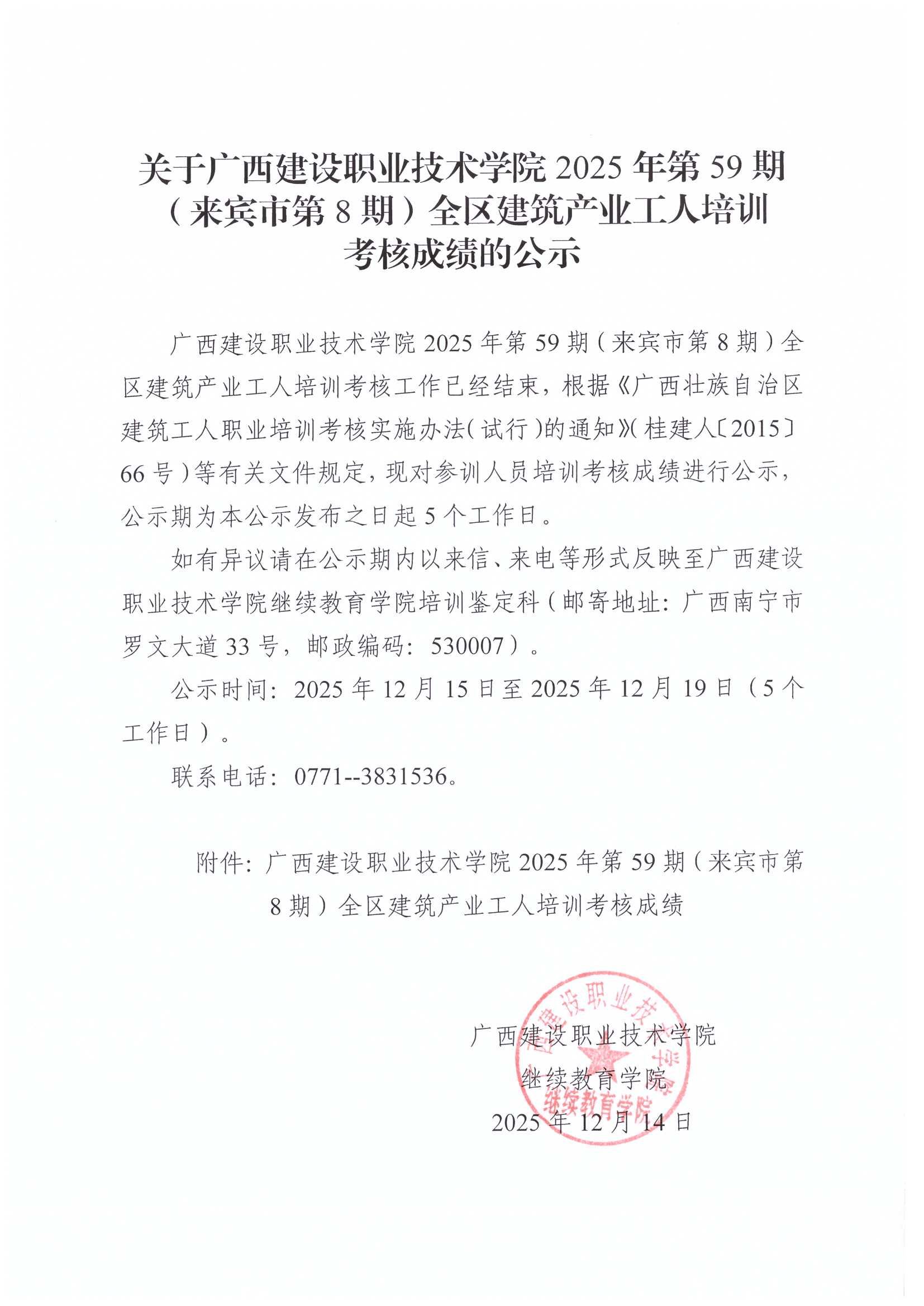 培训信息 当前位置: 首页 >> 培训信息 >> 正文 关于od平台官方官网2025年全区od平台官方官网产业工人第59期(来宾市第8期)培训考核成绩的公示 发布日期:2025-12-15 点击: 附件【关于od平台官方官网2025年全区od平台官方官网产业工人第54期(来宾市第7期)培训考核成绩的公示.pdf】已下载次