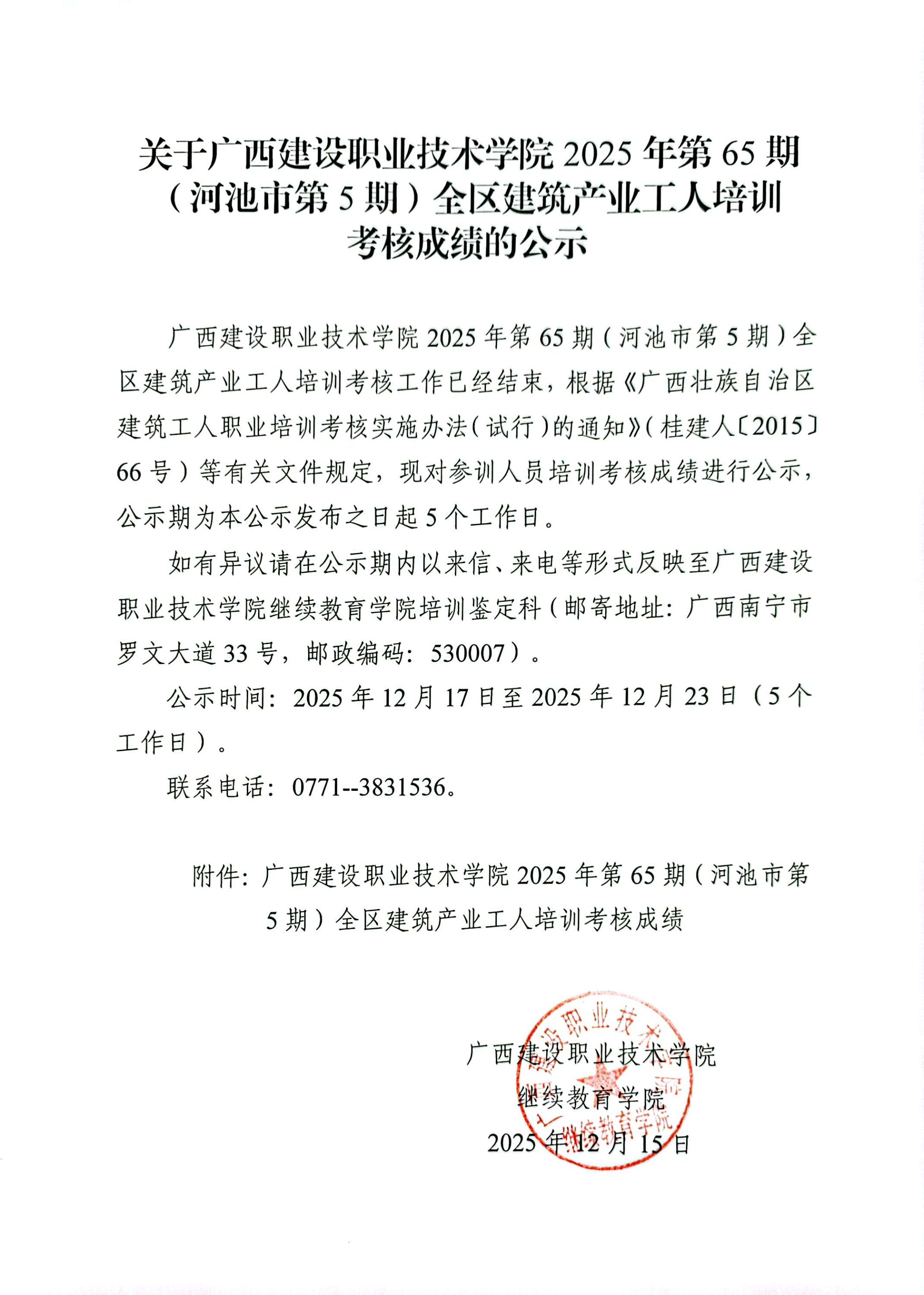 培训信息 当前位置: 首页 >> 培训信息 >> 正文 关于od平台官方官网2025年第65期(河池市第5期)全区od平台官方官网产业工人培训考核成绩的公示 发布日期:2025-12-17 点击: 附件【关于od平台官方官网2025年第65期(河池市第5期)全区od平台官方官网产业工人培训考核成绩的公示.pdf】已下载次