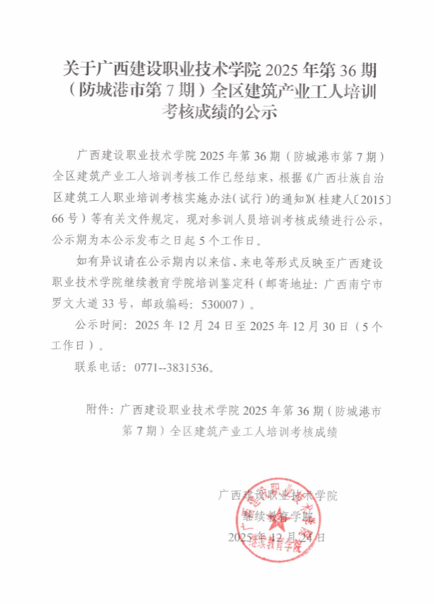 培训信息 当前位置: 首页 >> 培训信息 >> 正文 关于od平台官方官网2025年全区od平台官方官网产业工人第36期(防城港市第7期)培训考核成绩的公示 发布日期:2025-12-26 点击: 附件【关于od平台官方官网2025年全区od平台官方官网产业工人第36期(防城港市第7期)培训考核成绩的公示.pdf】已下载次