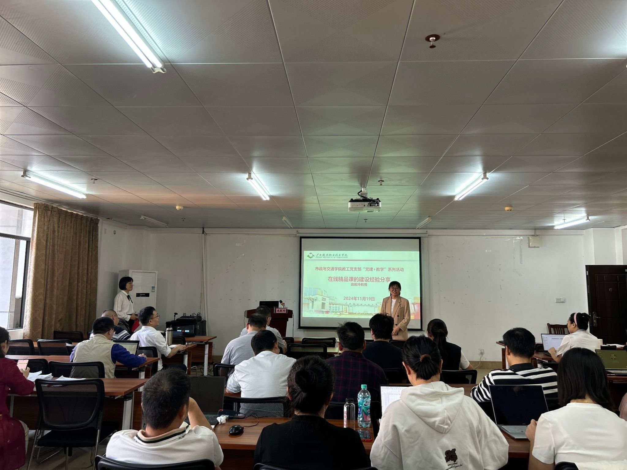 市政与交通学院11月21日讯(图/文 黄群)为进一步强化师资队伍建设,提升教师精品课程开发意识和开发能力,全力打造优质课堂,11月19日,市政与交通学院教工党支部开展了“建设精品在线开放课程,推动教育教学创新”在线精品课的建设经验分享主题党日活动。活动由土木工程学院庞毅玲教授主讲,教工党支部全体党员教师参加。