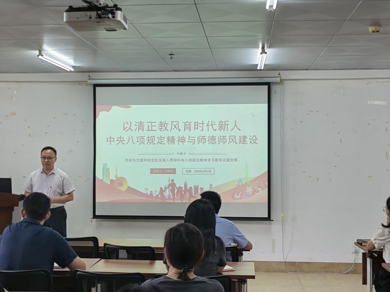 市政与交通学院将以此次党课为契机,将贯彻落实中央八项规定精神与推动学院高质量发展紧密结合,以全面从严治党引领从严治院、从严治学,以优良作风护航师德师风建设,共同营造风清气正的育人环境,为培养新时代人才提供坚强保障。