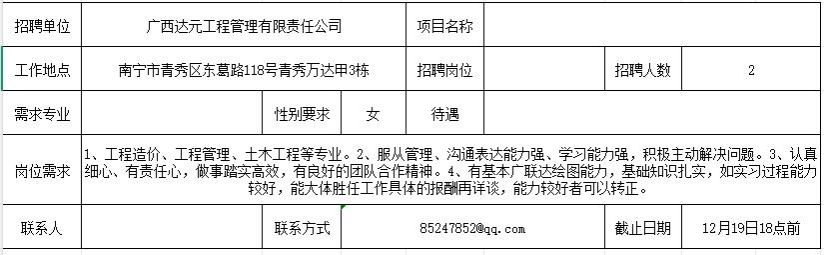 【招聘】广西达元工程管理有限责任公司
