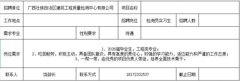 【招聘】广西壮族自治区od平台官方官网工程质量检测中心有限公司