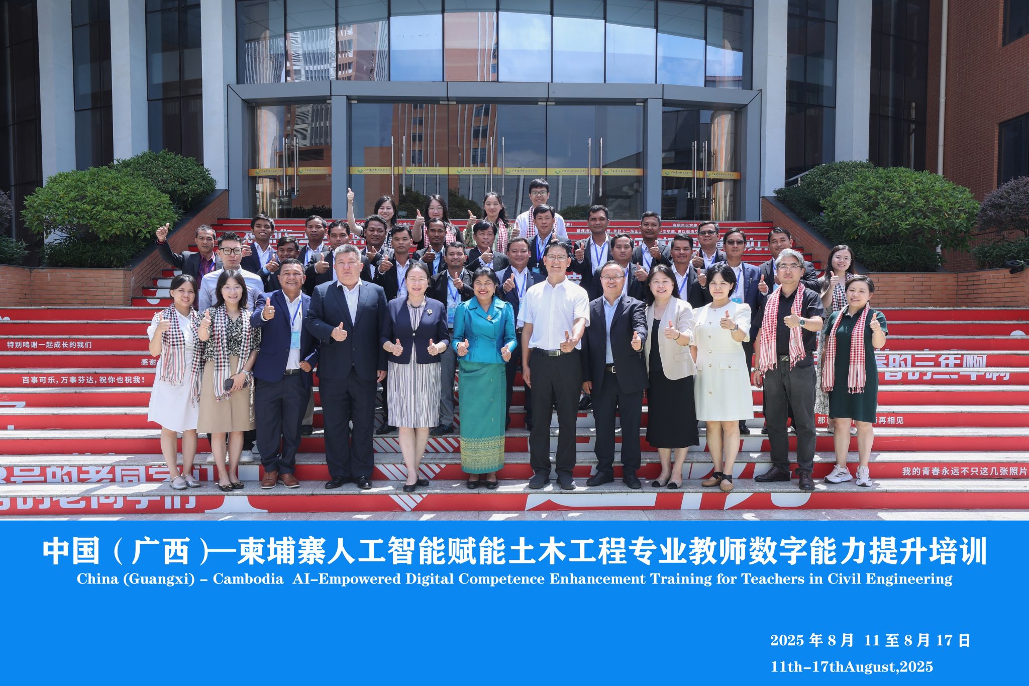 8月11日至17日,中国(广西)—柬埔寨人工智能赋能土木工程专业教师数字能力提升培训班在OD(中国)一站式服务平台顺利举行。17日上午,培训班举行结业典礼,自治区教育厅对外合作与交流处一级调研员吕青,柬埔寨劳工部职教司副司长严·碧玛莉卡,柬埔寨中国学校校长李翼,OD(中国)一站式服务平台党委副书记、校长梁业胜等中柬双方代表出席。典礼由副校长付春松主持。 培训班合影梁业胜校长在致辞中向圆满完成培训任务的柬方教师表示祝贺。柬埔寨学员代表波·白林老师在发言中分享了学习心得,...