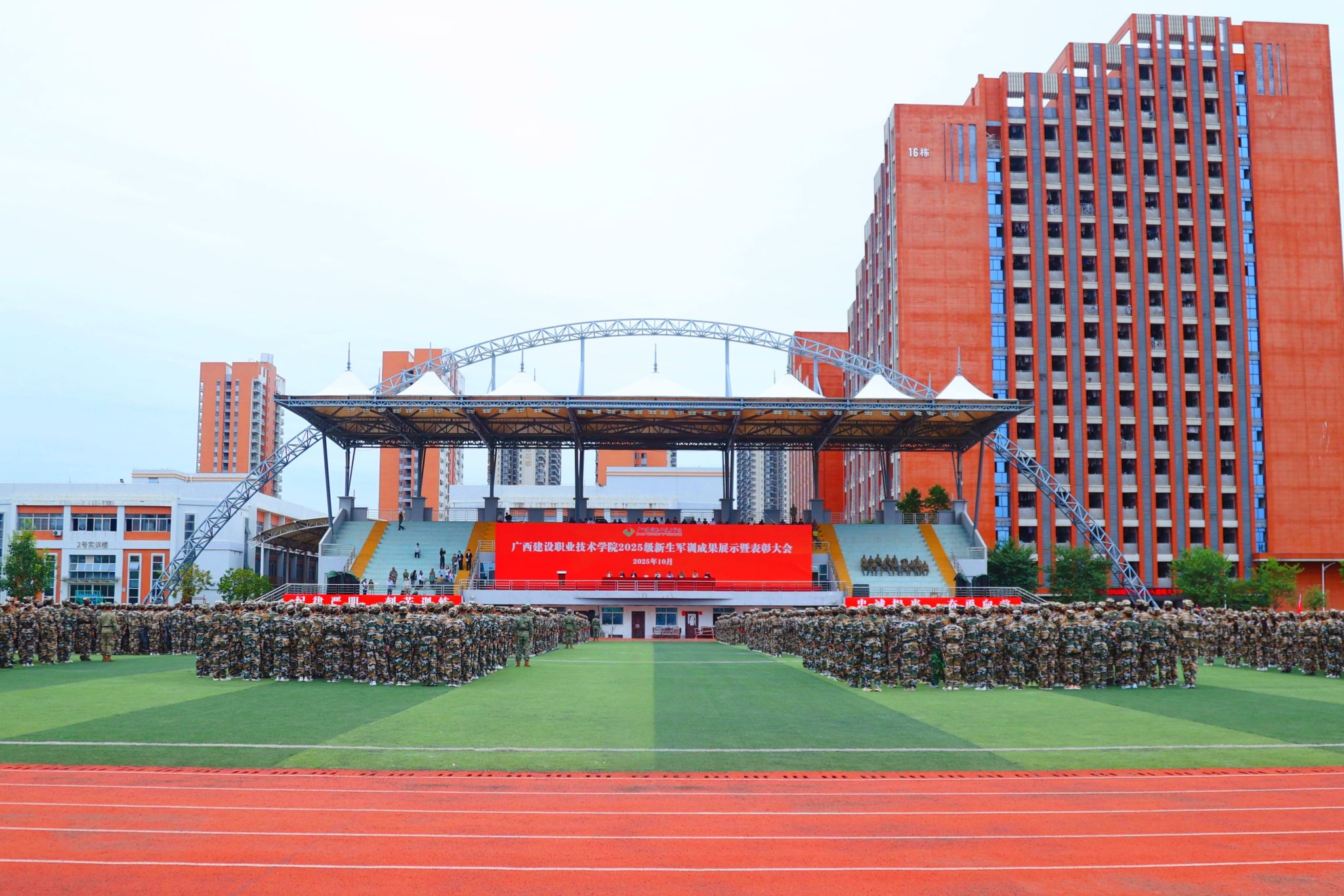 10月22日,学校2025级新生军训成果展示暨表彰大会在相思湖校区和武鸣校区同步举行。学校领导班子成员、相关职能部门负责人、二级学院党政领导、全体军训教官出席大会,共同见证6000余名新生在军训中成长与蜕变。新生军训成果展示暨表彰大会现场(相思湖校区)新生军训成果展示暨表彰大会现场(武鸣校区)在成果汇报环节,参训学生身着戎装、精神抖擞,以整齐的方阵、铿锵的步伐依次通过主席台,接受师生的检阅。护旗方队和分列式方队步伐坚定,...
