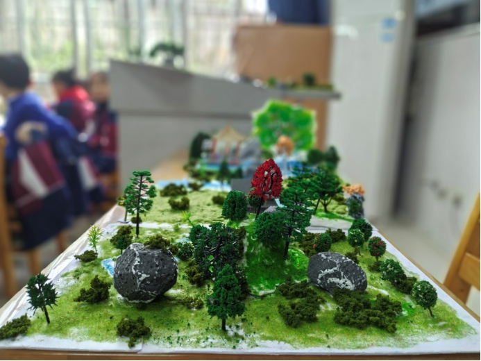 宣讲结束后,同学们在“绘美乡村”志愿服务团成员的热情带领下,开启了园林微缩景观营造活动。他们充分发挥自己的想象力与创造力,借助仿真树、石头、凉亭等材料,精雕细琢地打造出一个个独具匠心的园林微缩景观,仿佛将中式园林的魅力与情致都凝聚在这一方小小的天地之间。这项活动不仅提升了同学们的艺术素养与动手能力,还让大家对中式园林文化有了更为深刻的感悟与认识。