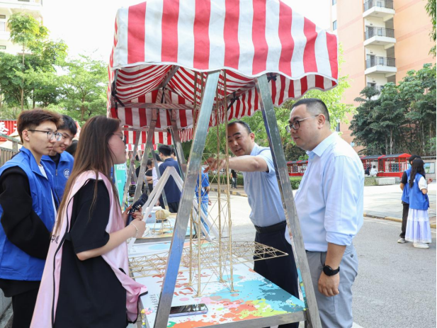广西建院4月16日讯(土木工程学院 文/石明成 苏艳玲 图/朱运基 赵子丞)为大力弘扬鲁班精神,培育新时代工匠人才,4月15日,由校团委主办、土木工程学院团总支与学生社区四公寓功能型团总支承办的第二十届校园科技文化艺术节首届鲁班技能展在学生宿舍开幕。校团委书记曾小贵,土木工程学院党总支书记孔祥刚、副院长(主持工作)谢华、副院长葛春雷等领导出席活动,与师生代表共同见证这场技能与文化的盛宴。