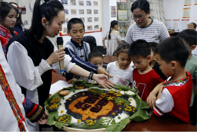 在“舌尖上的民族美食”环节,志愿者通过“猜猜民族菜”互动游戏,引导居民竞猜各民族特色菜肴,并生动讲解五色糯米饭的文化寓意。居民们还共同制作了“民族团结五色糯米饭拼盘”,拼出“大同社区7+1民族一家亲”字样,现场欢声笑语不断。