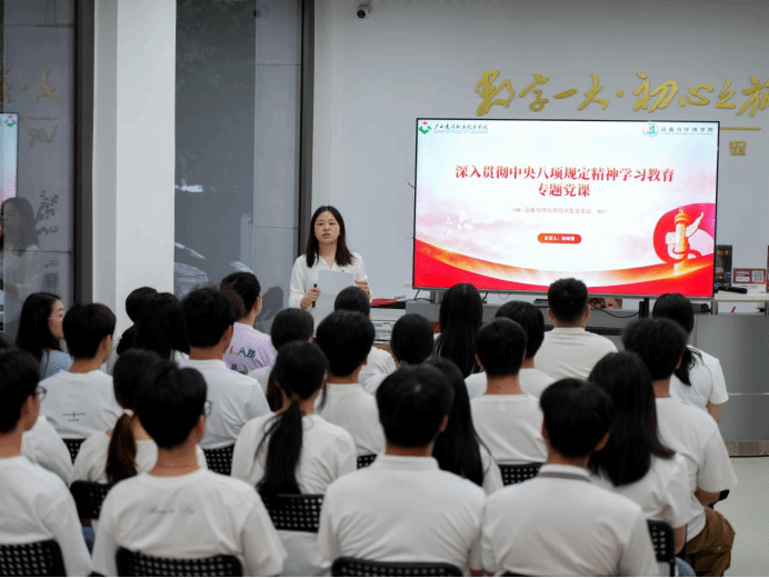 VR体验环节结束后,学生党支部书记徐晓雪老师以“八项规定砥初心,严守纪律树清风”为主题,为全体师生讲授了一堂生动深刻的专题党课。她强调,作为青年学生党员,必须始终保持政治清醒,以党纪党规为标尺,严格规范自身行为。