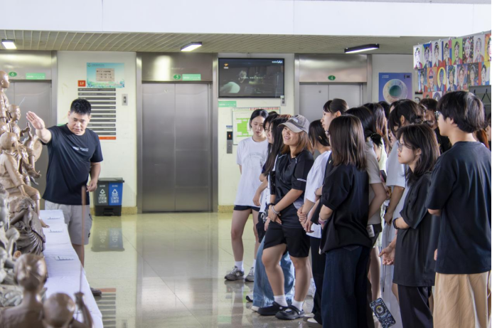 覃石胜老师为师生介绍《瑶童塑梦》系列南丹白裤瑶题材雕塑作品