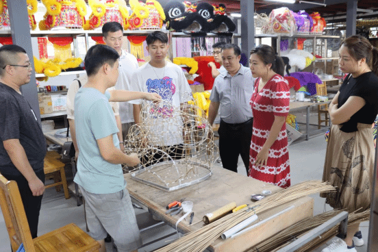 第一站,师生们来到藤县中等专业学校。藤县狮舞以精湛的技艺闻名全国,2011年被列入第三批国家级非物质文化遗产保护名录。自2015年起,藤县中等专业学校增设主修舞狮技艺方面的运动训练专业,以校企合作、产教融合的模式,建设扎制作坊,由企业派出师傅到学校任教,开展狮头及工艺品扎作,进一步打造藤县狮舞民族文化传承创新职业教育基地的品牌。在校内龙狮扎作艺术馆,调研团队成员向师傅们询问了解龙狮扎作技艺,学习狮头的制作过程和竹编工艺。同时,队员们还与藤县狮舞文化有关的民间传承人进行了交流和互动,更切身地感受到“非遗”文化的博大精深。