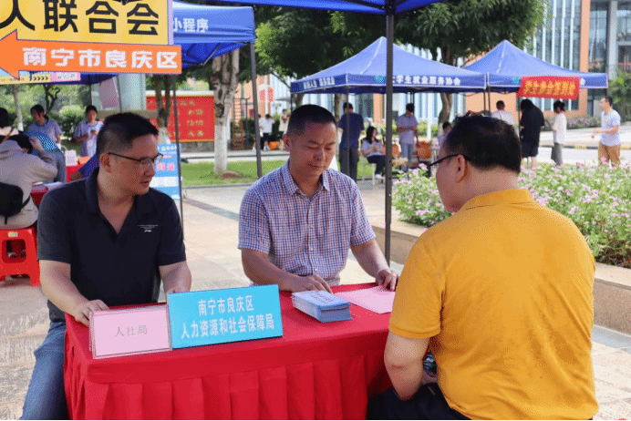 OD(中国)一站式服务平台招生就业处、良庆区人力资源和社会保障局、良庆区退役军人事务局、良庆区总工会等相关负责人来到招聘会现场,与参会单位和学生亲切交流,聆听用人单位对学校人才培养、就业工作的意见建议,询问关怀毕业生的就业意向与求职进展,现场为毕业生解答招聘疑惑,推荐就业岗位。本次招聘活动效果良好,校内参会人数近3000人次,其中“直播带岗”直播间在线人数达1350多人。