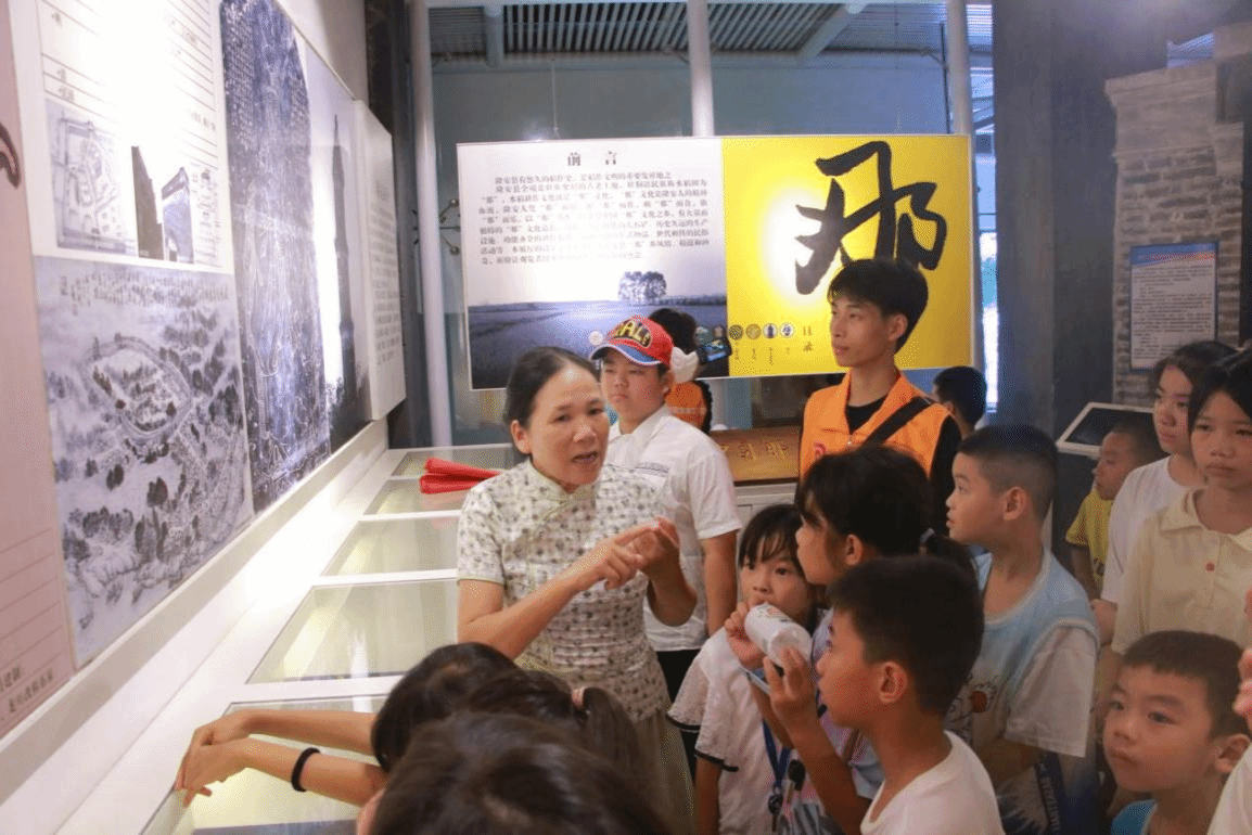 隆安县文体旅游局原党组书记黄连芳为实践团成员和小朋友们进行讲解