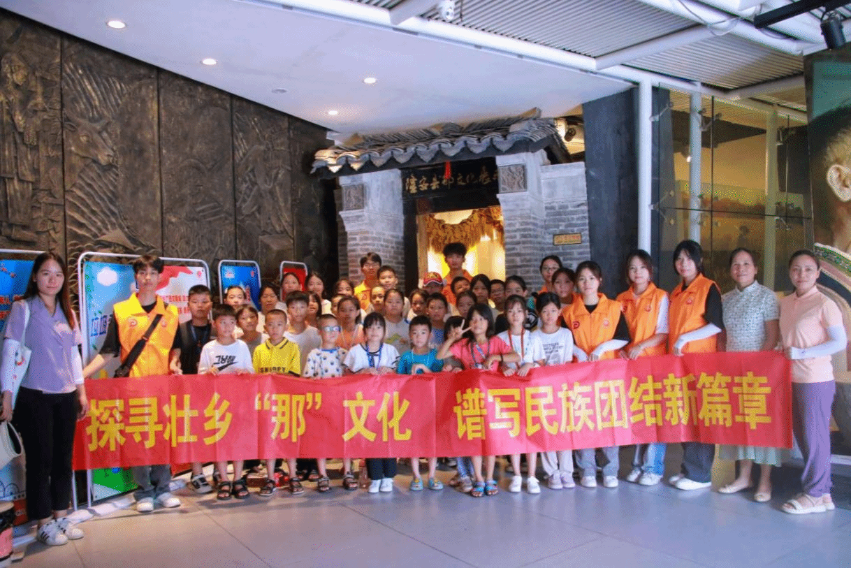 实践团成员和小朋友们参观结束后在隆安县那文化展示厅合影
