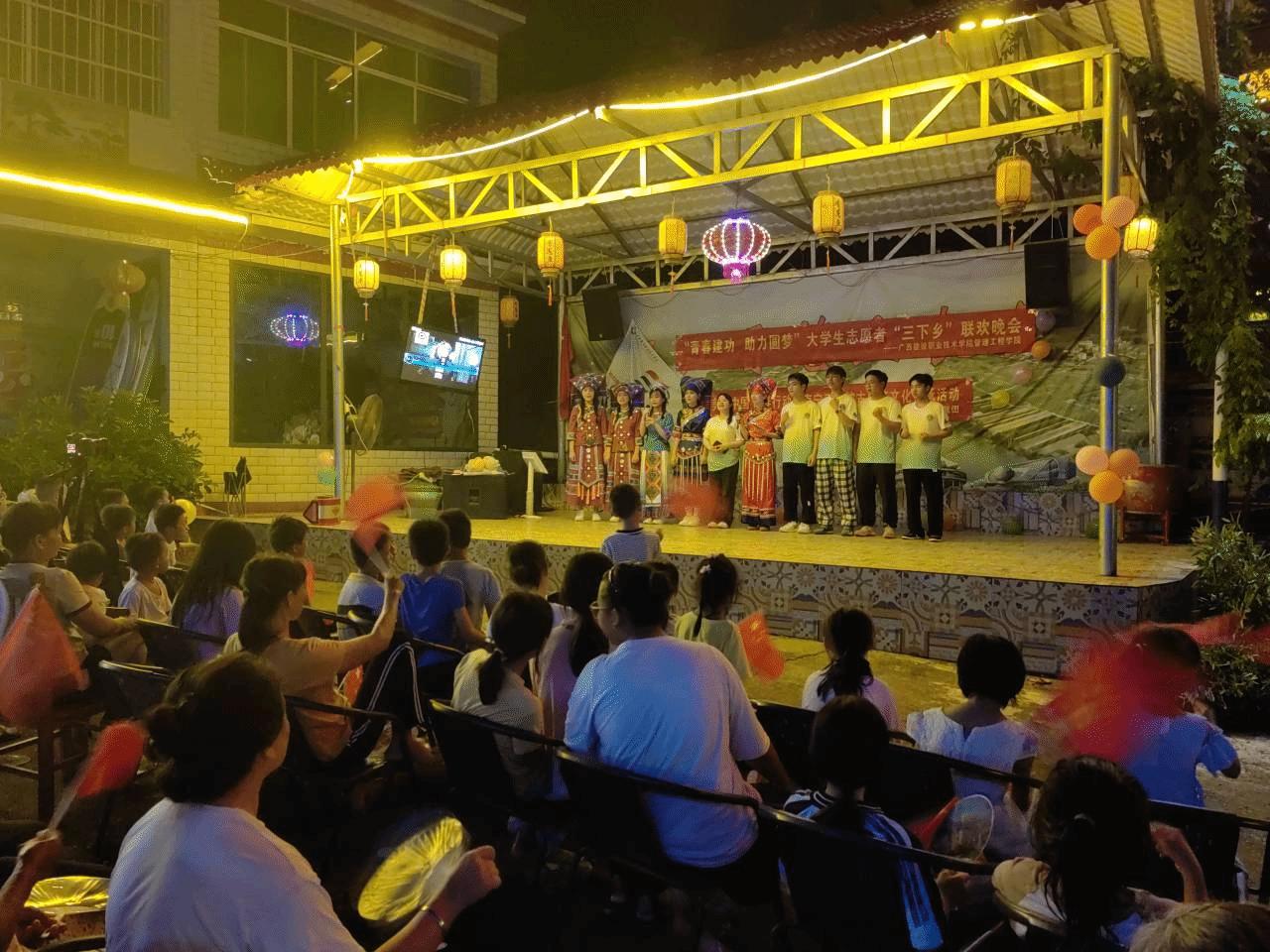 实践团以举办“美丽中国 青春行动”主题文艺晚会为载体,展现乡村建设成效。晚会结合生态文明理念、党的二十大精神、乡村振兴等内容呈现了多个节目,既传递了党的好声音好政策,也展示了三江坡环境洁净优美、村民生活安康舒适的新农村图景。三江坡全体村民应邀出席文艺晚会,实地体味这个“小乡村”的“大变迁”。
