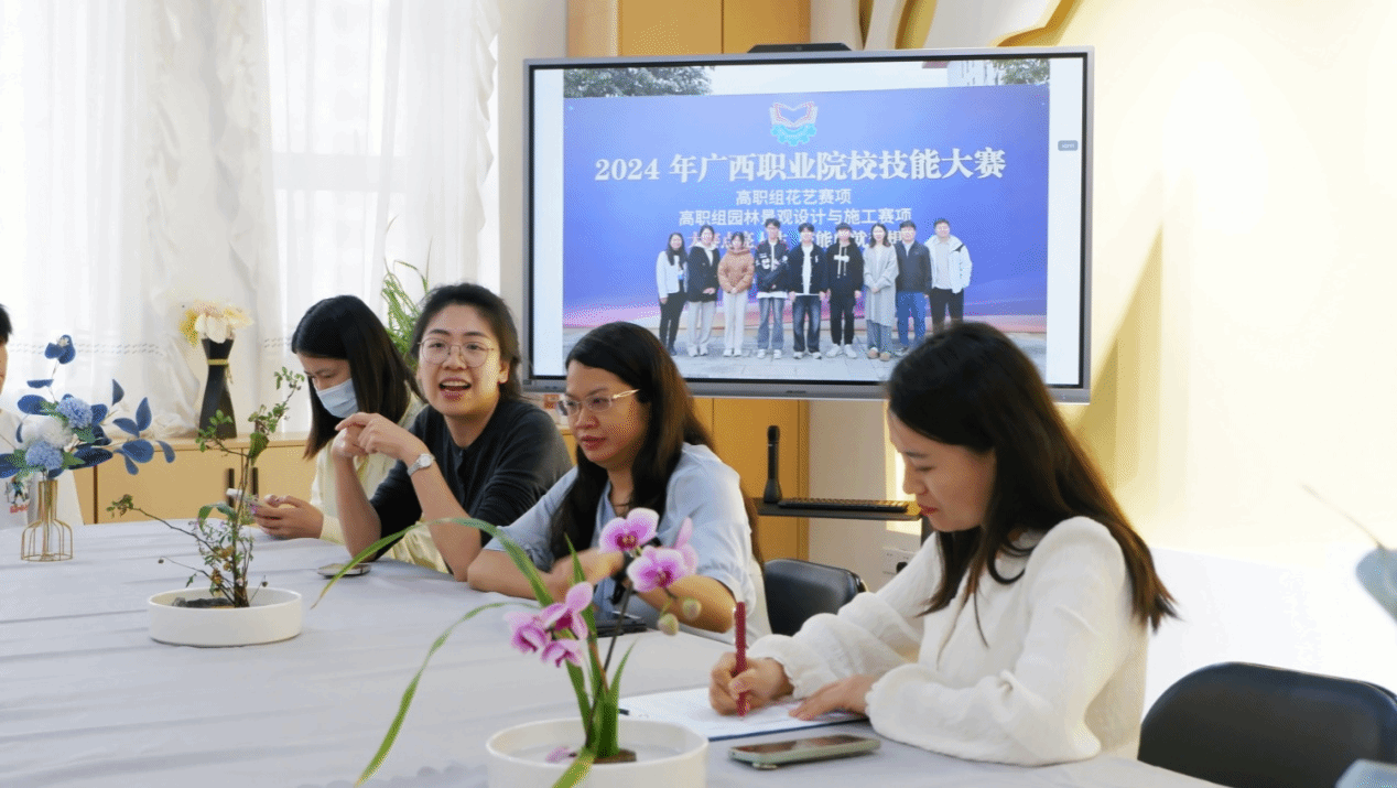 校内指导老师易敏、朱秋敏、陈璟如等三位老师从以赛促学、赛教融合的角度,鼓励同学们积极参赛,提升技能,立志成长为高素质技术技能型人才。资深插花大师、校外企业指导老师杨雨轩分享了自身机缘巧合跨行花艺界的故事,鼓励同学们保持热爱和激情,开辟一片更加广阔的新天地。