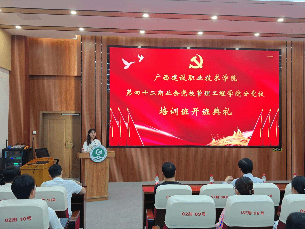广西建院5月9日讯(管理工程学院 文/孙文 图/陈振彪 陈昭鑫)5月8日,管理工程学院在二号教学楼701报告厅举行第四十二期分党校培训班开班典礼。管理工程学院党总支书记代端明,学生支部支委以及培训班全体学员参加会议。会议由学院党总支专职组织员赖小华老师主持。