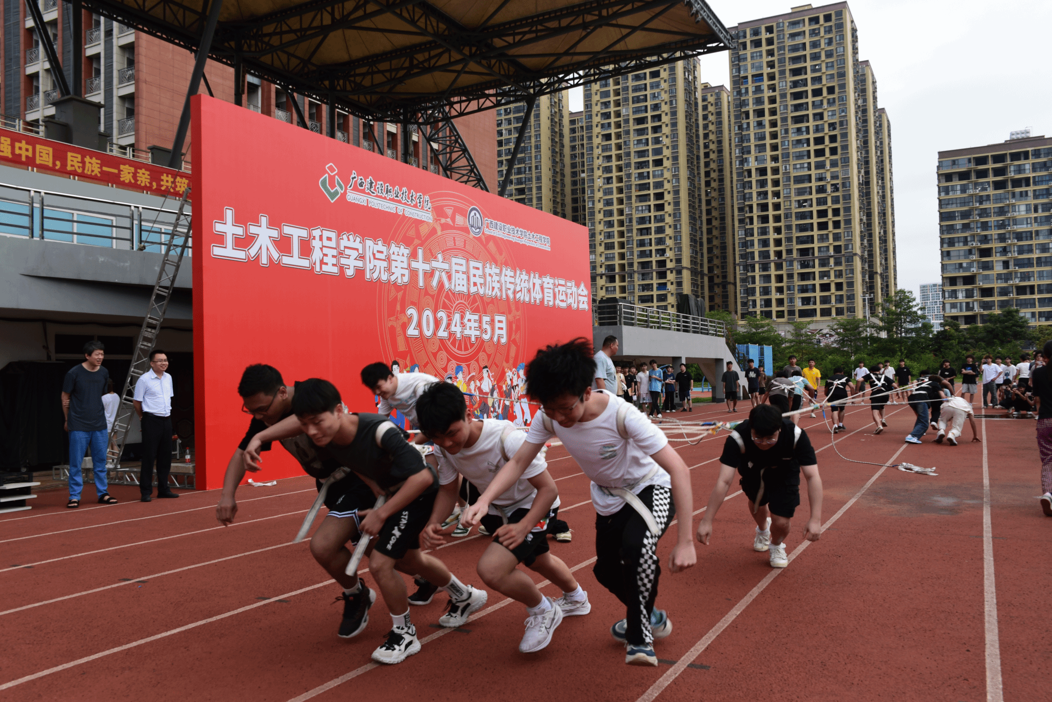 广西建院5月29日讯(土木工程学院 文/石明成 图/王海昕 黄健 韦景朝)为弘扬中华民族优秀传统文化,全面促进学生身心健康,5月28日下午,土木工程学院在学校田径场举办第十六届民族传统体育运动会开幕式。土木工程学院党总支书记孔祥刚,院长李朝阳,副院长葛春雷、罗献燕等学院领导出席,全体辅导员、班主任代表以及全体在校学生参加开幕式。