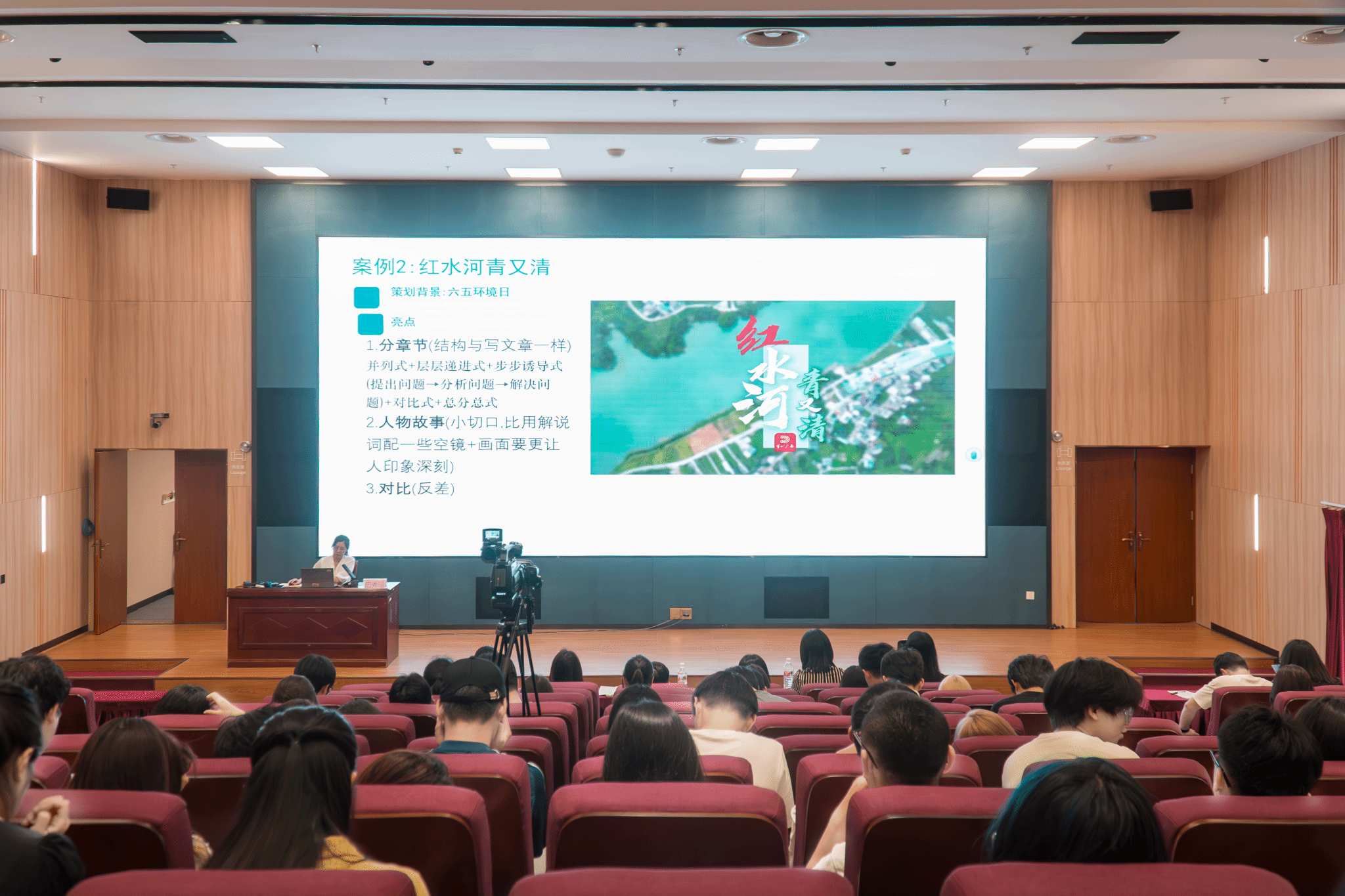 在两个多小时的讲座中,阳秀琼主任结合自身丰富的实战经验,和大家分享了短视频的创作理论及实践经验。她用浅显易懂的语言介绍了短视频的类型概念、短视频策划的关键要素、短视频主题与风格匹配选择、如何使用丰富的表现手法、参与度和互动性的提升等知识,分享了包括剪辑节奏与叙事结构、特效与动画制作、音频编辑与混音、色彩校正与调色等后期制作技巧。同时,她还结合当前年度热门事件引导大家学会梳理寻找优秀的短视频创意,并通过对《这就是广西酸嘢》《红水河青又清》等成功案例进行效果评估与数据分析,将专业“硬”知识变得生动有趣。整场讲座内容丰富、案例鲜活、生动精彩,受到了师生的一致欢迎和好评。