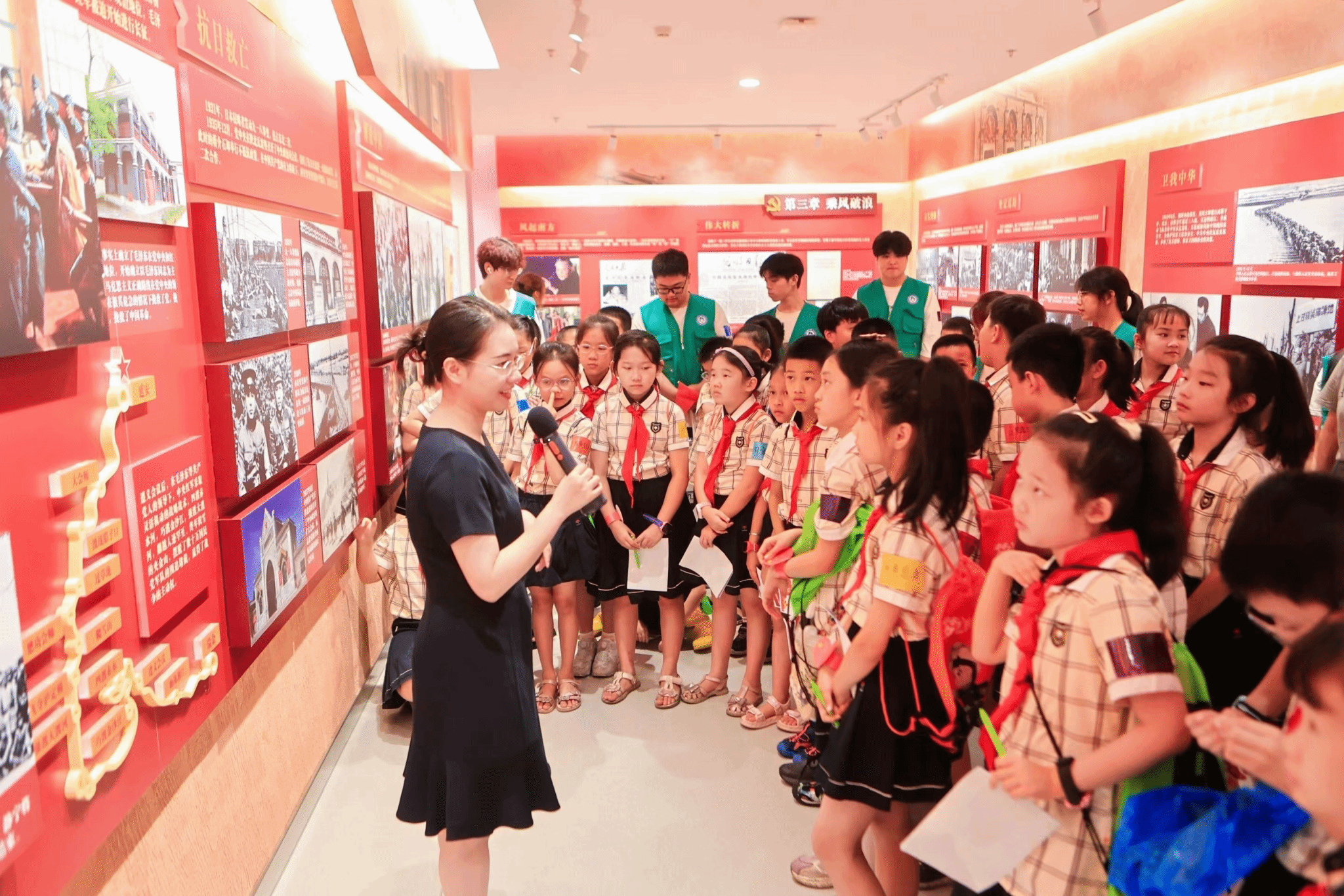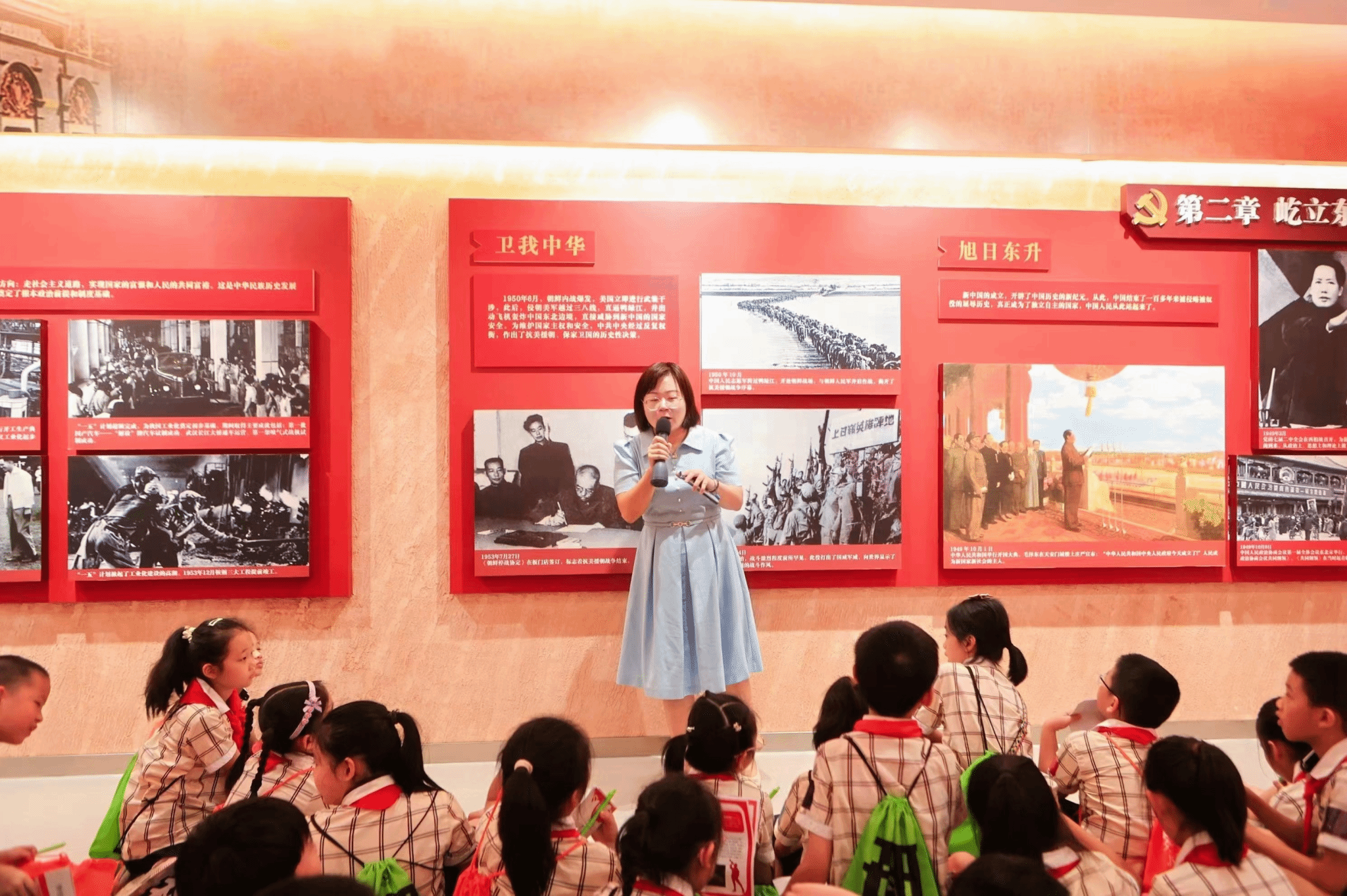 参观红色展馆,感受光辉历程。小朋友们走进党史馆,与黄哲和甘麒燕两位老师一起互动交流。通过生动的语言和详实的历史资料,两位老师向孩子们讲述自中国共产党建党以来几代人筚路蓝缕艰苦奋斗的伟大征程,激发孩子们爱国爱党的热情。两位老师还精心设计了红色知识探秘环节。孩子们带着问题,在各场馆内自由寻找答案。互动式的学习方式不仅激发了孩子们的学习兴趣,也让他们更加主动地参与到研学活动中来。