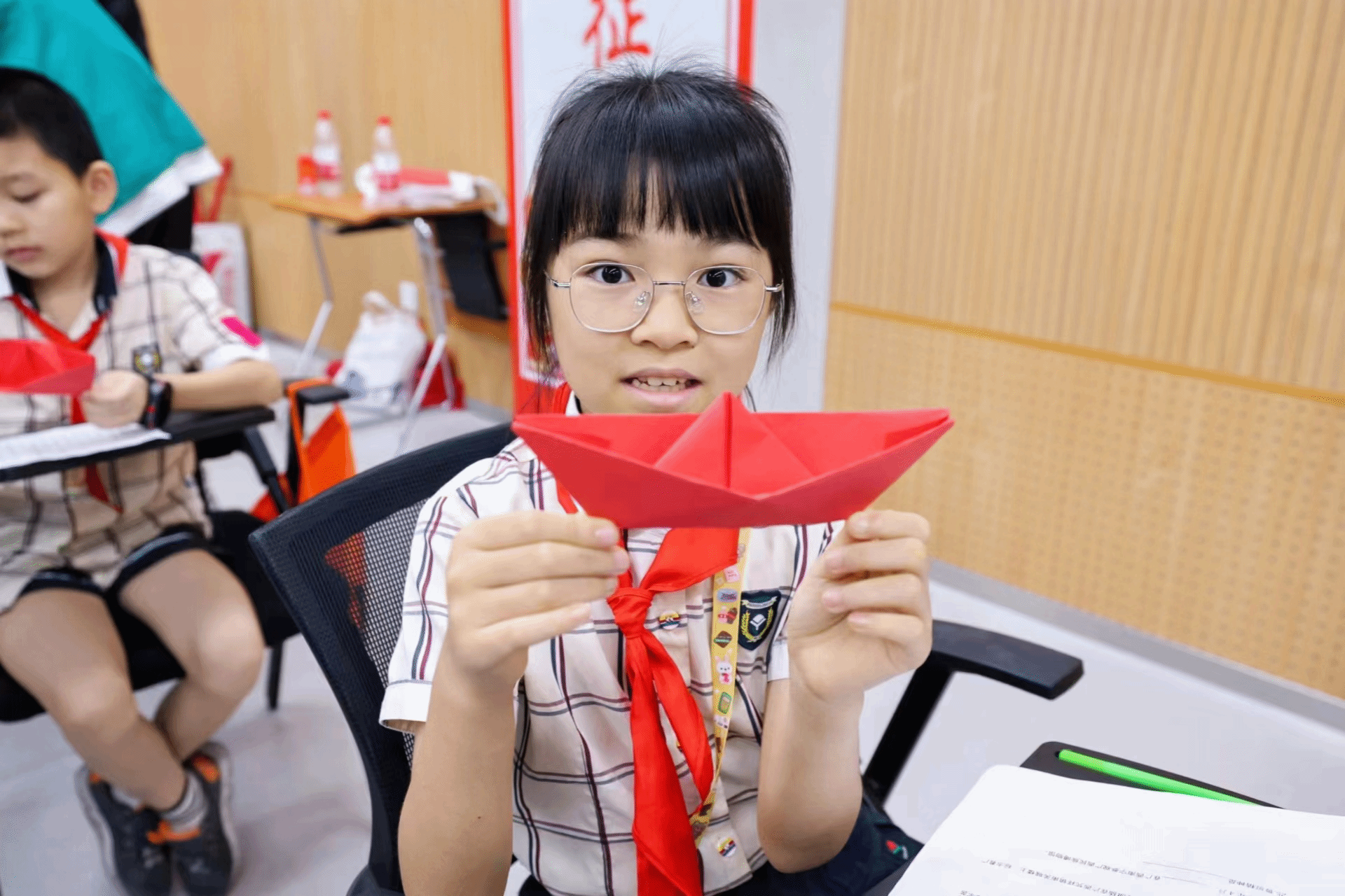 巧手折叠红船,传承红色基因。红船,见证了中国共产党的诞生,成为中国革命源头的象征。蒙文艳老师在虚拟仿真教育基地带领小朋友们一起折红船,以此表达对先辈的敬仰之情和对红色基因的传承之意。覃楚舒小朋友高高举起自己的作品向大家展示,说道:“我折叠了一艘属于自己的红船作品,在制作的过程中,让我想起了中共一大一开始在上海召开,后来被迫转移到了嘉兴南湖红船继续进行的历史。”