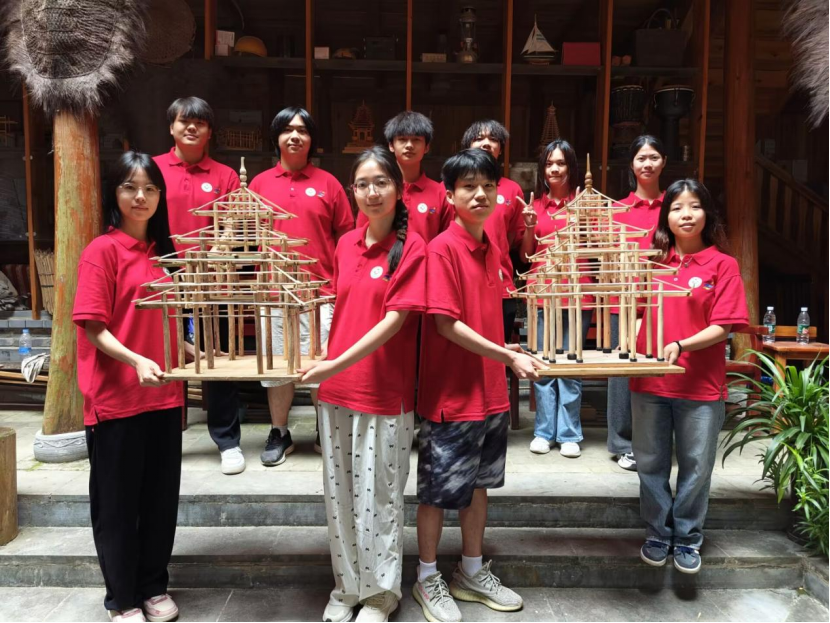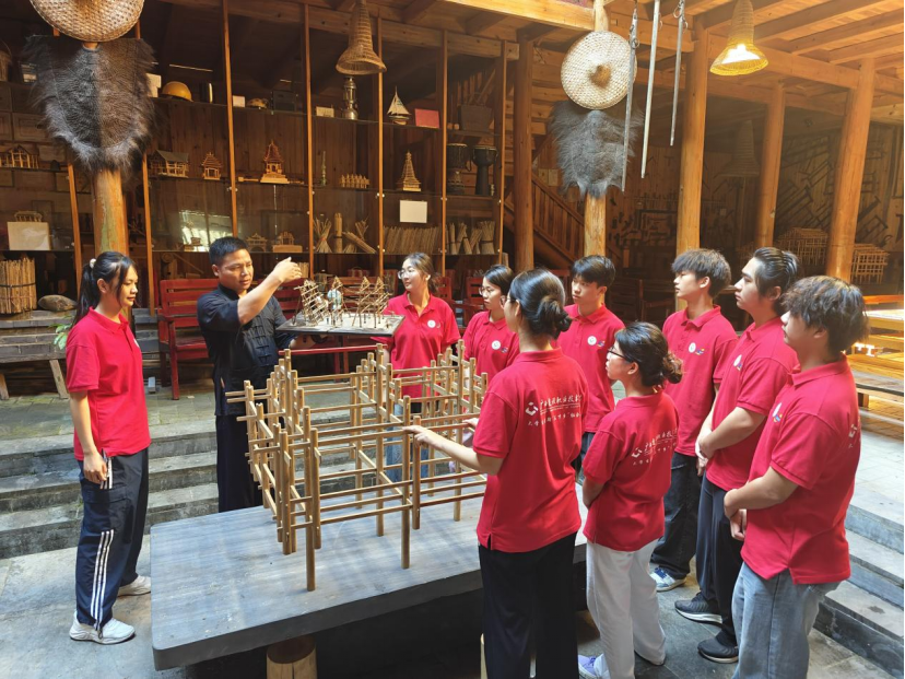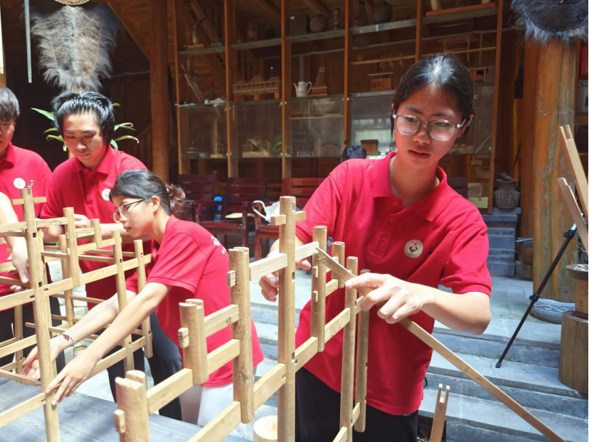 传承团成员还原搭建吊脚楼模型