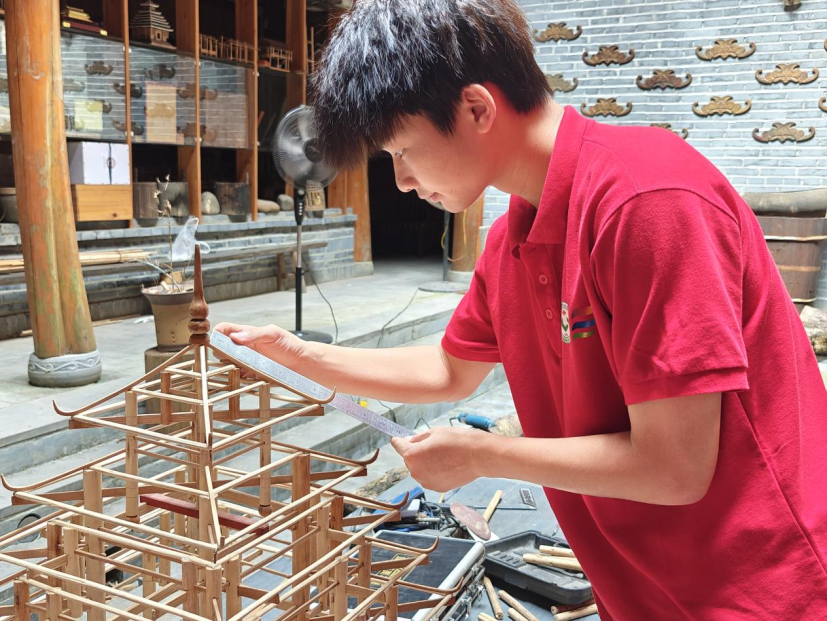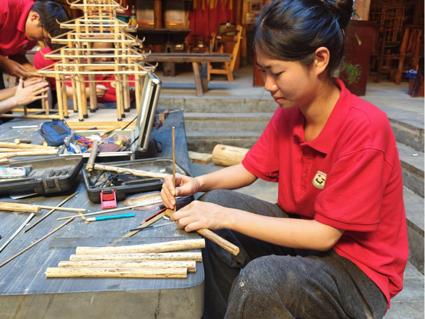 传承团成员制作鼓楼模型——穿梁接拱