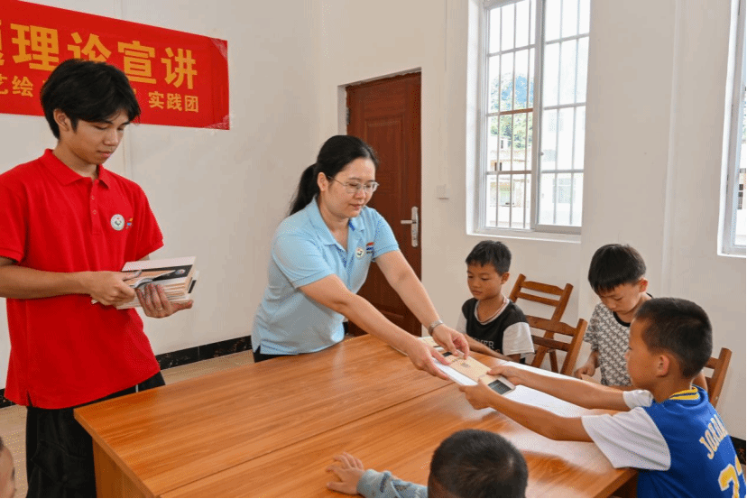 上好一堂宣讲课。实践团成员围绕广西边境元素,通过讲红色故事的方式,在汤亮村、三友村给小学生们上了一堂“民族团结”宣讲课,并通过知识问答的形式吸引小学生们进一步了解中国革命历史文化,激励大家要牢记历史,做好守护祖国南疆大门的靖西好儿女。实践团成员们还给现场小学生们发放了民族团结主题宣传册,与边境基层孩子们在共同学习中建立了深厚的友谊,绘制了一幅充满爱与希望的成长蓝图。
