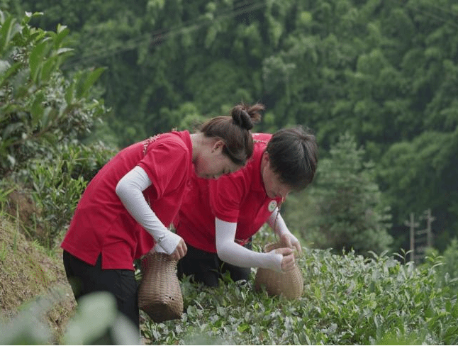 深入茶园,感悟农耕文化。实践团成员腰挎茶篓,深入茶园,帮助茶农采摘茶叶。在茶农的指导下,成员们学习到了六堡茶的采摘标准为一芽两叶,采摘时不可紧捏、紧压,以免芽叶破碎,既要保证摘下的芽叶完整,又不能伤害到茶树。弯腰、伸手、采摘,一次次重复着相同的动作,队员们体验了农耕生活的辛勤与耐心,品味了收获的乐趣。