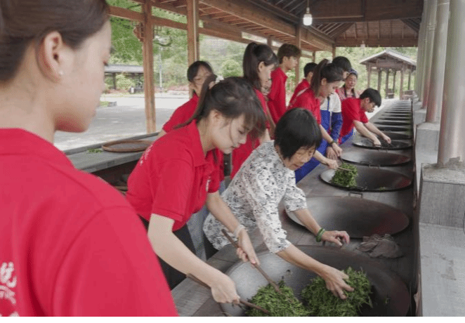 在韦洁群大师的指导下,实践团成员亲身体验了晾青、杀青、揉捻、堆闷、复揉、烘干等古法制茶技艺工序。“杀青时一定要控制火候,茶青下锅后,要先焖炒再扬炒……”“揉捻时要用手掌心轻揉,不宜加压过久……”韦洁群大师一边细致地讲授其中要领,一边手法娴熟地进行操作示范,实践团成员认真地跟随韦洁群大师操作。从茶青到成品茶,层层工序,让实践团成员对古法制茶技艺有了更深的认识,加深了对六堡茶文化的理解和认同,也让大家更加珍惜每一杯香茗背后的付出。