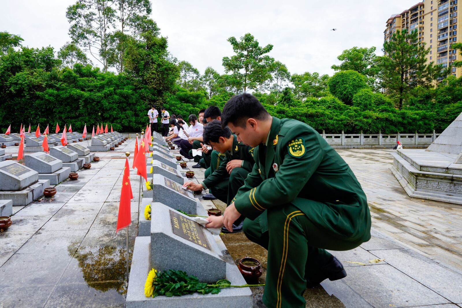 瞻仰先烈受洗礼,红色血脉永相传。防城城北烈士陵园,安息着332名烈士,他们以青春和热血捍卫了国家尊严。实践团成员们向英烈碑敬献鲜花,并细心擦拭每一块墓碑,表达对为国捐躯先烈的深切缅怀与崇高敬意。陵园内的纪念馆里陈列着大量珍贵史料与实物,再现了那段峥嵘岁月,仿佛提醒着实践团成员要铭记历史,珍惜和平,以实际行动践行爱国之志。