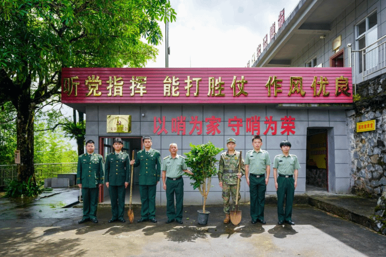 戍边楷模话国防,青年学子心中敬。实践团步行40分钟抵达尖峰岭哨所,见到了曾5次进京接受表彰的爱国戍边楷模—陆兰军,他一家三代4口人为国守疆45年的事迹被广泛宣扬。在陆兰军和现任哨长闭正法的介绍下,实践团成员们了解了哨所的历史和重要意义,聆听了戍边光荣事迹,共同回忆了那段峥嵘岁月。大家还穿过工事见到了“猫耳洞”,站在哨岗前观察国境线,真正体验了一次“哨兵”经历。“对面的山峰,就是当时自卫还击战‘高巴岭战役’的主战场。” 陆兰军指着远处的山峰说道。通过走访,实践团成员们深深地感受到,今天祥和安宁的边境线是军民同心、英勇奋战换来的,要倍加珍惜。期间,实践团向哨所赠送了象征和平与友谊的幸福之树。