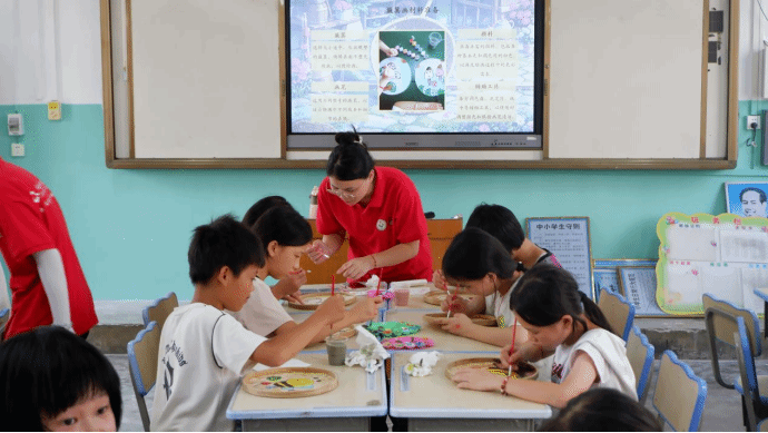 为丰富青少年假期生活,加强青少年美育教育,提升美育素养,实践团成员在红渡中心小学开展了两期美育微课堂。一是开展传统文化赏析课,宣扬中华优秀传统文化,增强文化自信,涵养传统美德;二是手绘簸箕创意画,实践团指导小朋友们画出心中美丽家乡风景,引导小朋友成为乡村振兴的积极倡导者和自觉践行者。