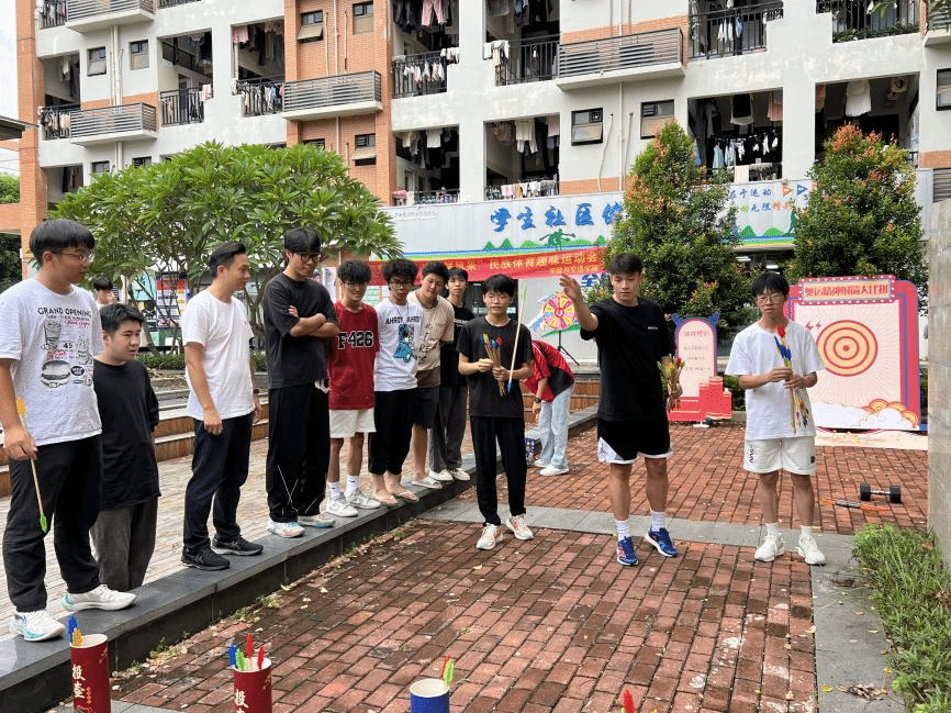 本次运动会共设置了“抛绣球”“八段锦”“射箭”“投壶”“打陀螺”等十多种民族体育项目。比赛开始前,民传体育陈红秀老师组织少数民族学生开展了一场“习八段锦”传统体育活动。在悠扬的音乐声中,同学们在老师的带领下缓缓抬手、下腰、提踵、左右开弓……,大家动作整齐划一,呼吸自然流畅,每一个招式都充满了力量之美。同学们在活动中感受到了中国传统文化的博大精深和健身气功的独特魅力。