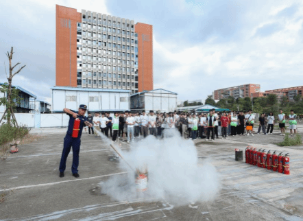 消防疏散演练结束后,赵站长为师生们进行消防器材的操作培训,详细讲解并示范了火灾现场的应急处置,灭火器的使用原理以及相关的注意事项。在认真听讲及观摩后,同学们进行了消防灭火器的实际操作,面对熊熊燃烧的火堆,师生们沉着冷静,熟练地按照灭火的步骤和方法,将汽油燃起的浓烟大火迅速扑灭。